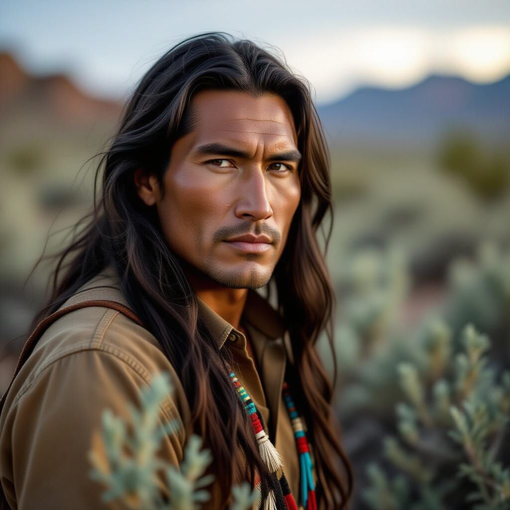 This image depicts a handsome Native American man with long hair standing by sagebrush. Captured with cinematic lighting and a subtle film grain, it evokes the look of a high-quality film still.