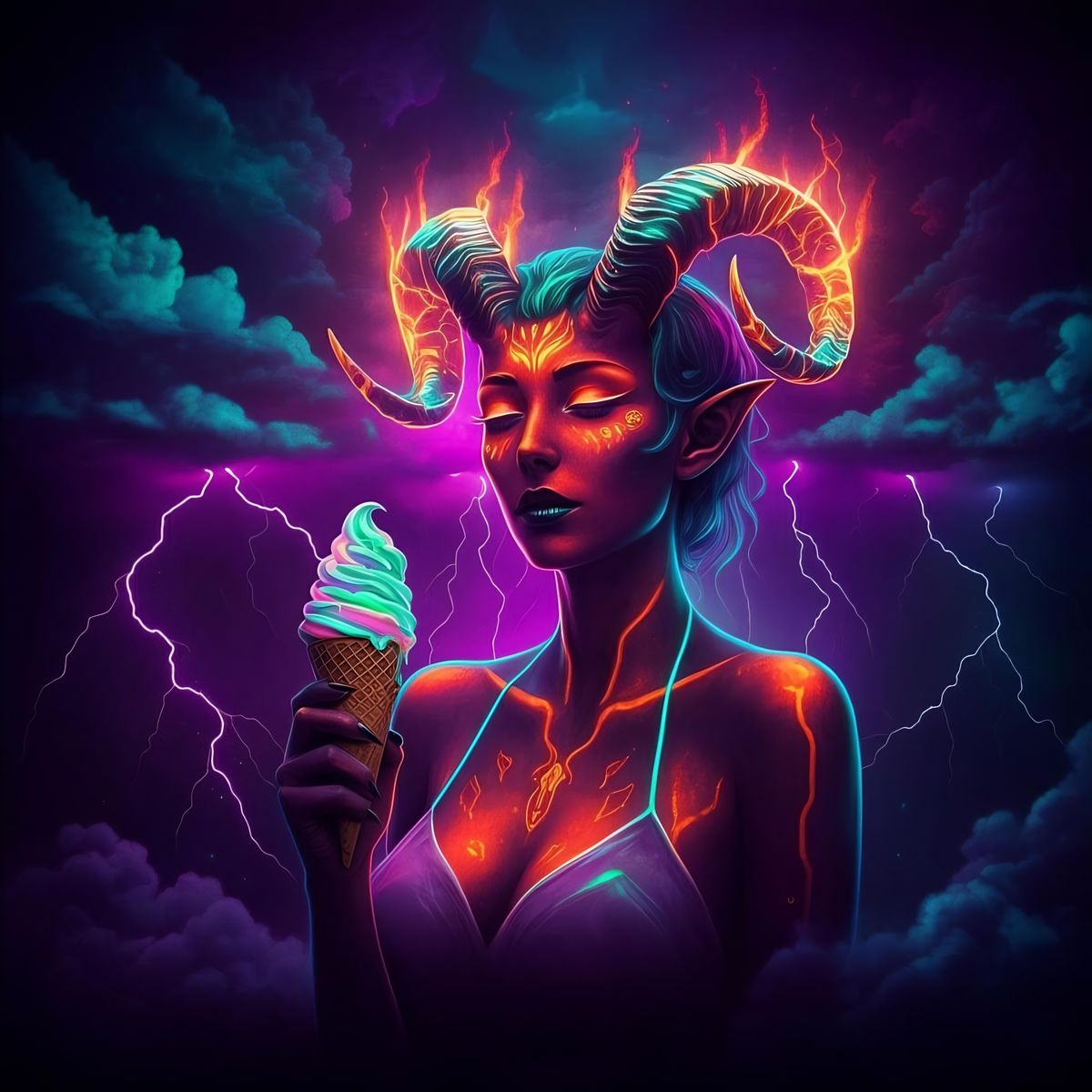 This image shows a beautiful demon woman with long, elemental horns, in a state of bliss while enjoying ice cream. The picture is ultra-photorealistic with double-exposure techniques, set in a neo-noir aesthetic.