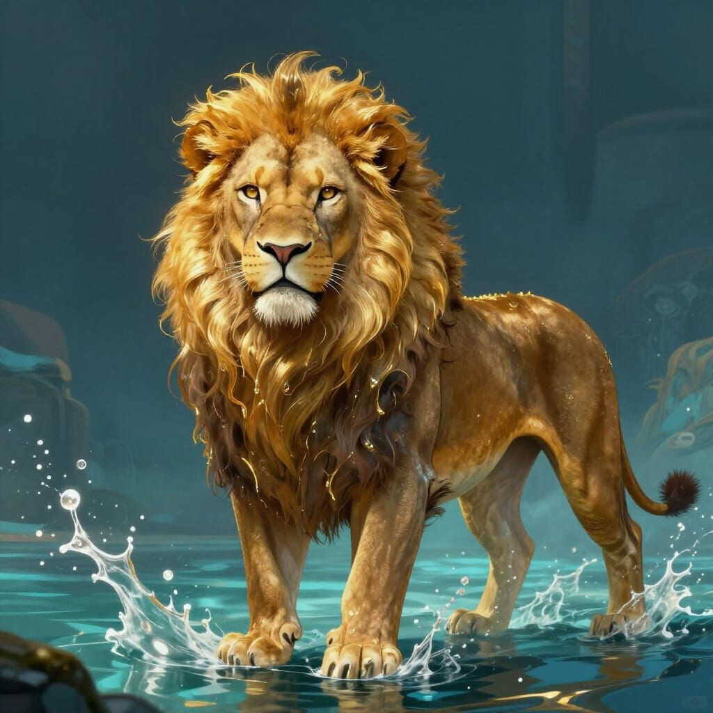 A majestic lion, "Le roi lion," stands in shimmering water, its mane like liquid gold. Detailed fantasy concept art with vibrant colors and breathtaking realism, 8k resolution.
