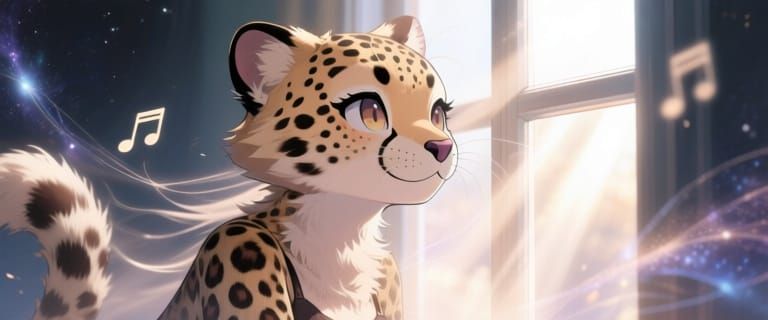This image shows an anthropomorphic cheetah girl bathed in soft, natural light, gazing out a window. The anime-style art features macro details, windswept dust, and cosmic strands for a dreamy effect.