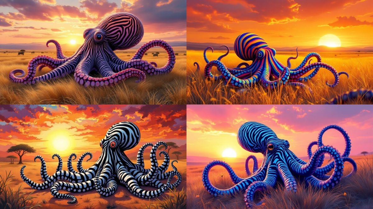 A vibrant image of an octopus with zebra stripes traversing the Serengeti at sunset, blending marine and savannah elements in a stunning visual display.