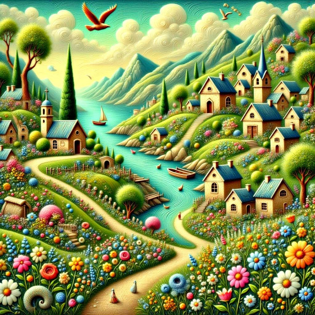This enchanting image depicts a serene coastal village with weathered stone houses, cobblestone streets, and lush greenery, set against a breathtaking sea view in soft pastel tones.