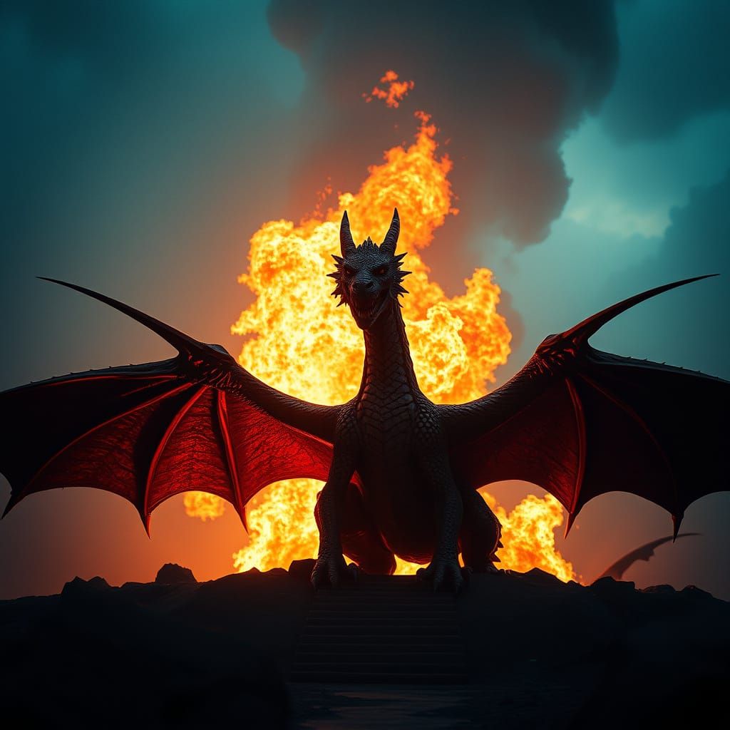 This image shows a formidable dragon dominating the scene amidst a fiery backdrop. The artwork features cinematic lighting, film grain and a vignette, with a color-graded, post-processed aesthetic reminiscent of fantasy art.