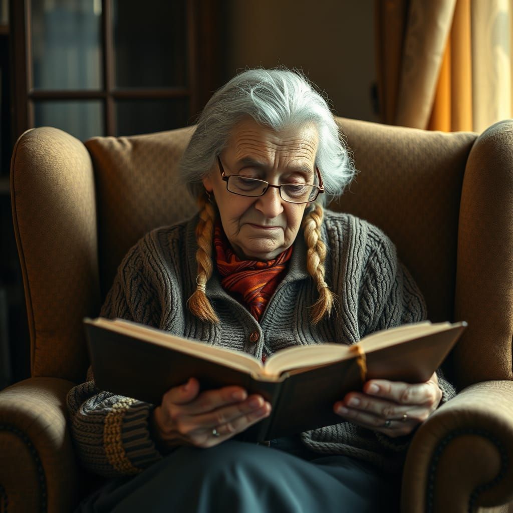 This image shows an elderly woman with braided hair reading in an armchair. Soft textures and muted colors evoke a classic storybook style, with ambient light creating a melancholic, nostalgic atmosphere. The portrait uses emotive and atmospheric lighting techniques.
