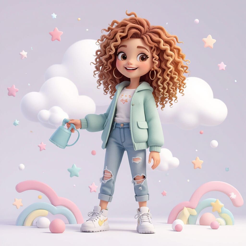 This image features a charming 3D character with soft pastel colors and curly hair, rendered in a delightful, stylized aesthetic.