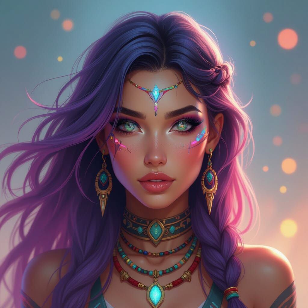 A digital painting of a futuristic woman with neon hair and tribal jewelry. The portrait features dramatic lighting and ethereal makeup in an art nouveau style.