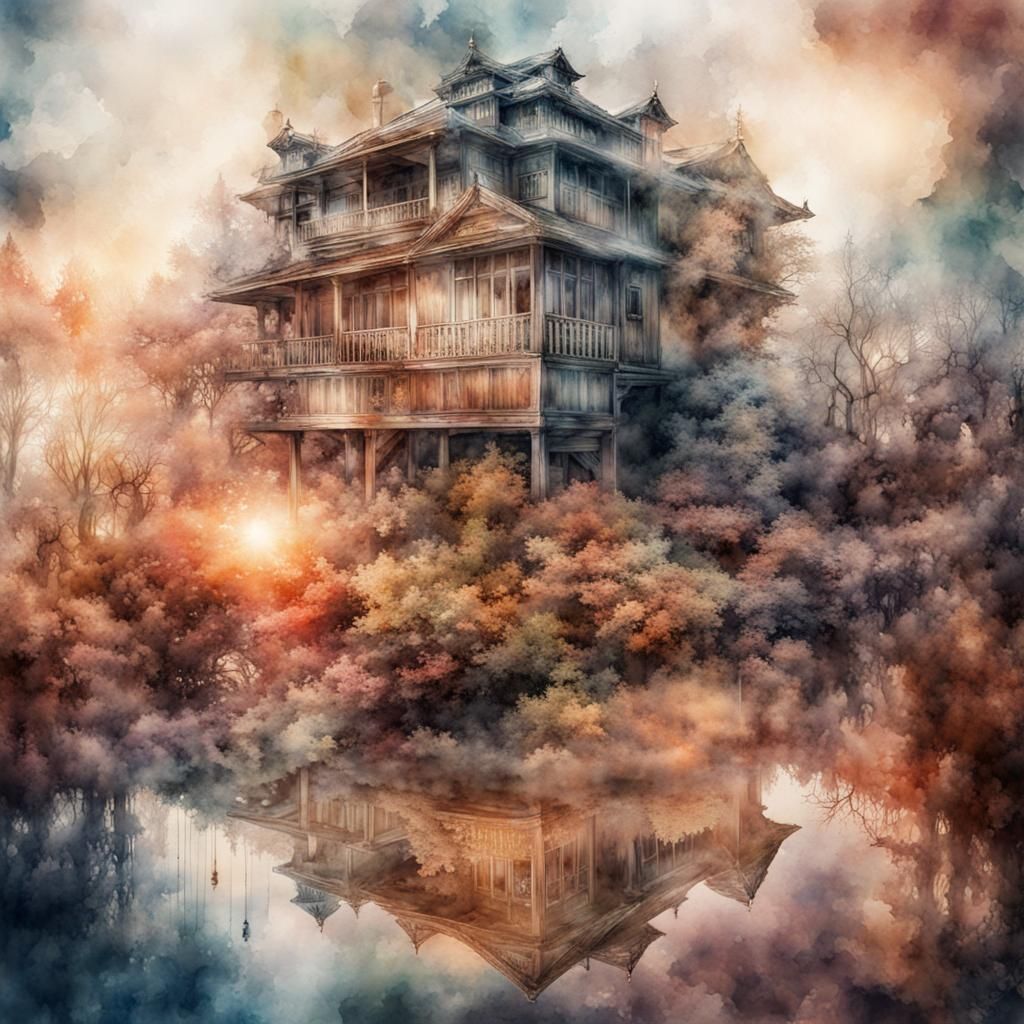 A vibrant double exposure fantasy image with intricate details and a moody, atmospheric feel. The hyperrealistic composition features sharp focus and high contrast in watercolor.