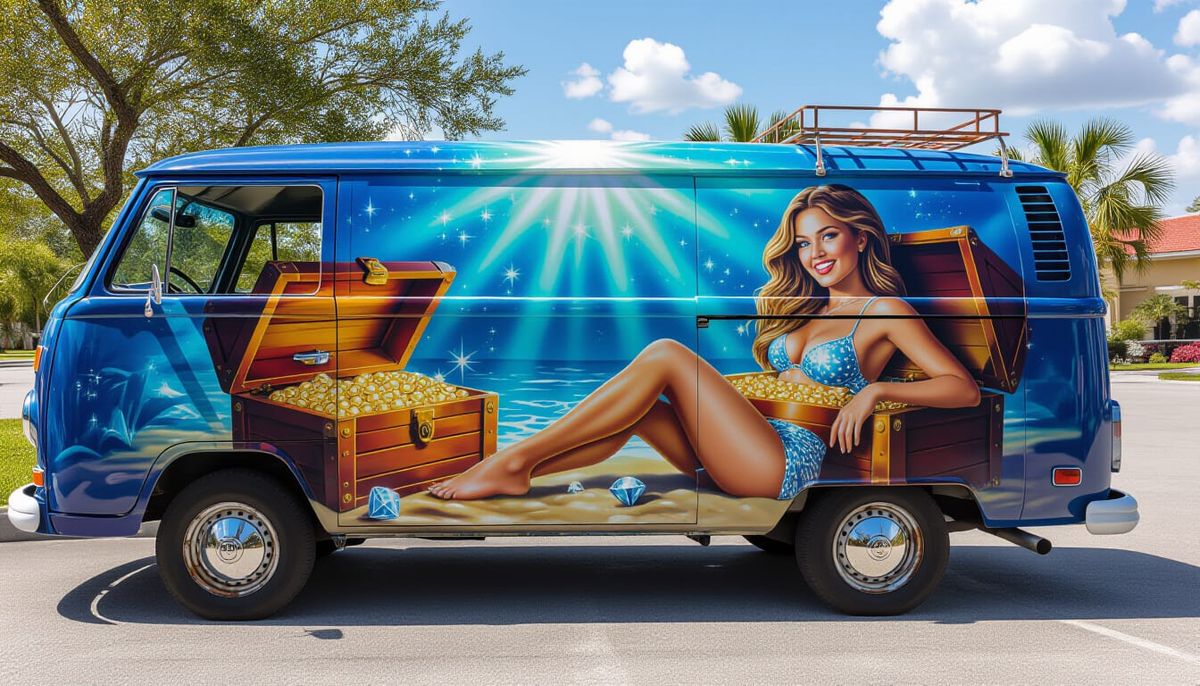 This image shows an airbrush-style mural on the side of a Chevy van. The mural depicts an adult woman, rendered in a vibrant, photorealistic airbrush aesthetic.