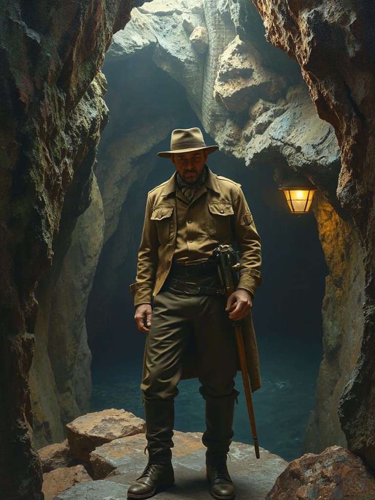 A striking picture of a Victorian explorer at the entrance to a cavern. This surrealist oil painting features vibrant colors, dramatic lighting and intricate details in a science-fiction aesthetic.