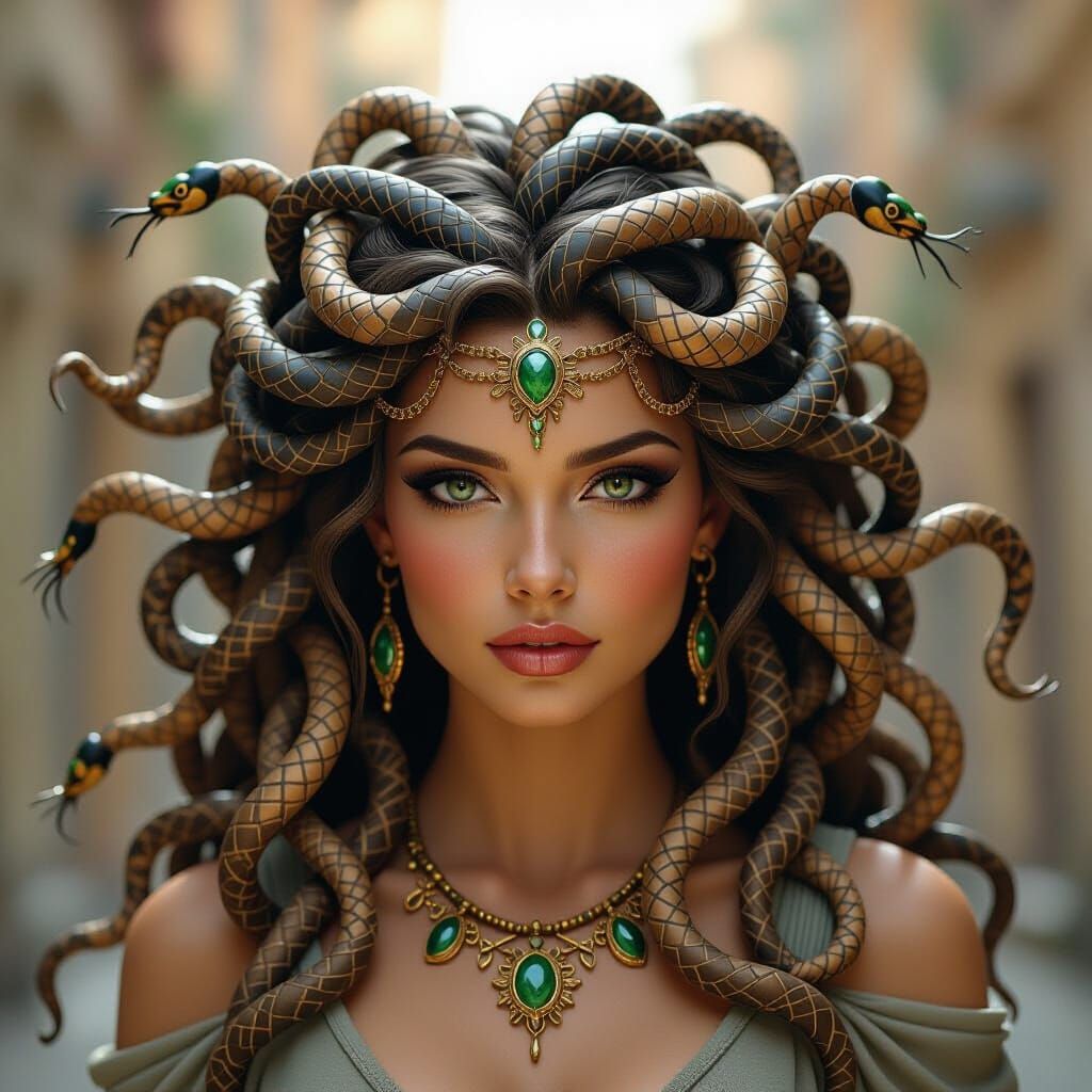 This image shows Medusa, the mythological Gorgon whose hair was made of living venomous snakes. The artwork depicts the iconic monster in a stylized manner.