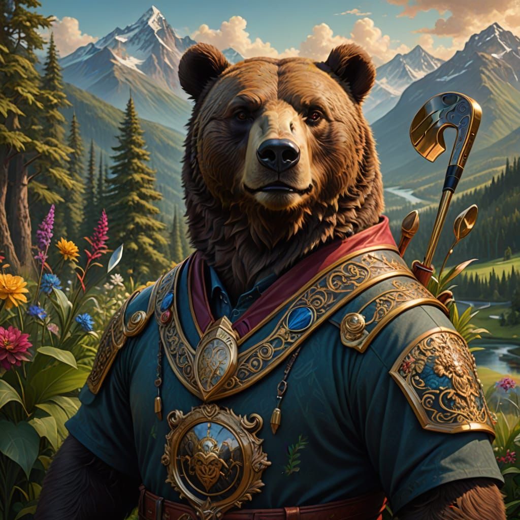 This image shows a highly detailed fantasy crest featuring a regal bear holding golf clubs, surrounded by lush foliage and majestic mountains, with rich, vibrant colors and golden accents.