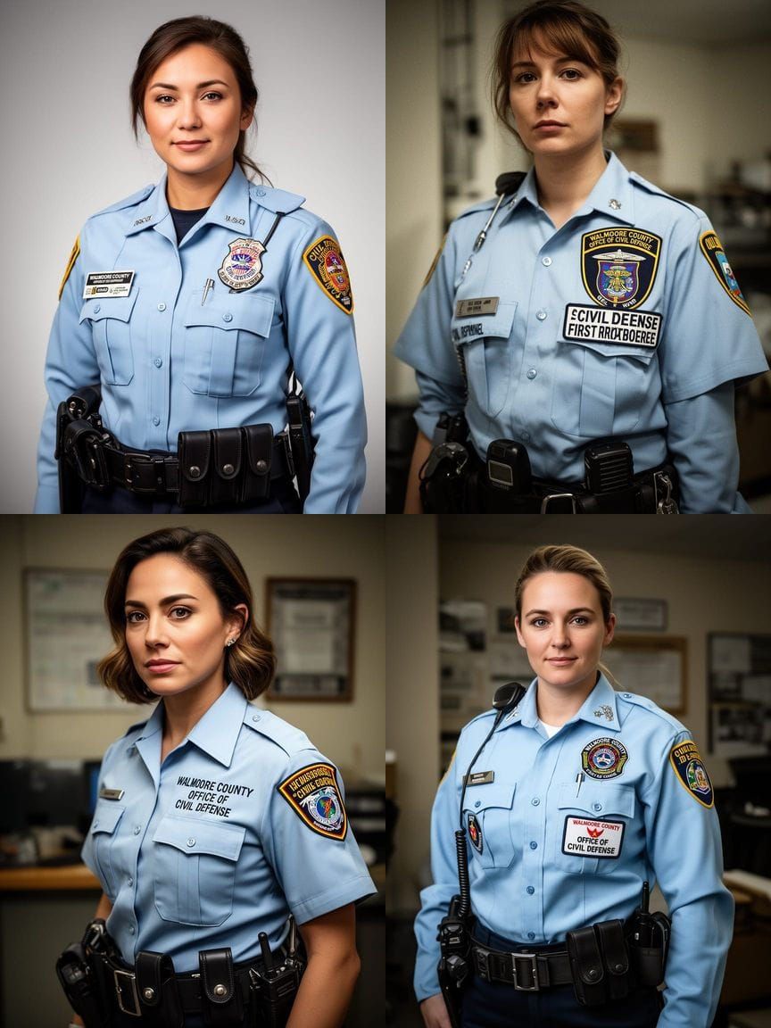This image shows a portrait of a female civil defense employee. She wears a vintage Cold War era patch on a modern county police-style uniform with a duty belt.