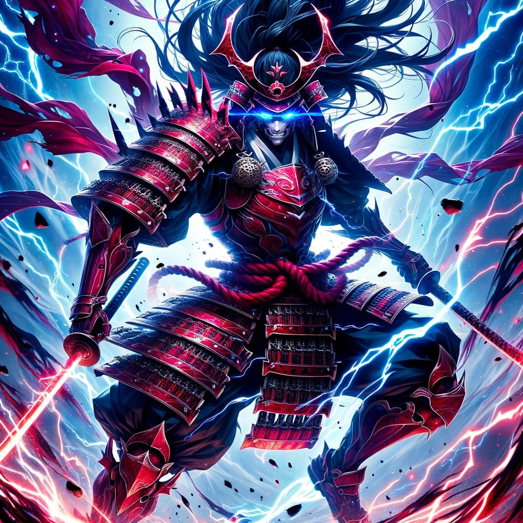 This image shows a powerful warrior clad in crimson samurai armor, poised for battle. A spectral warrior envelops him, glowing blue with sharp armor and blazing eyes. The scene is dramatically lit by crackling lightning amidst a tumultuous battlefield.