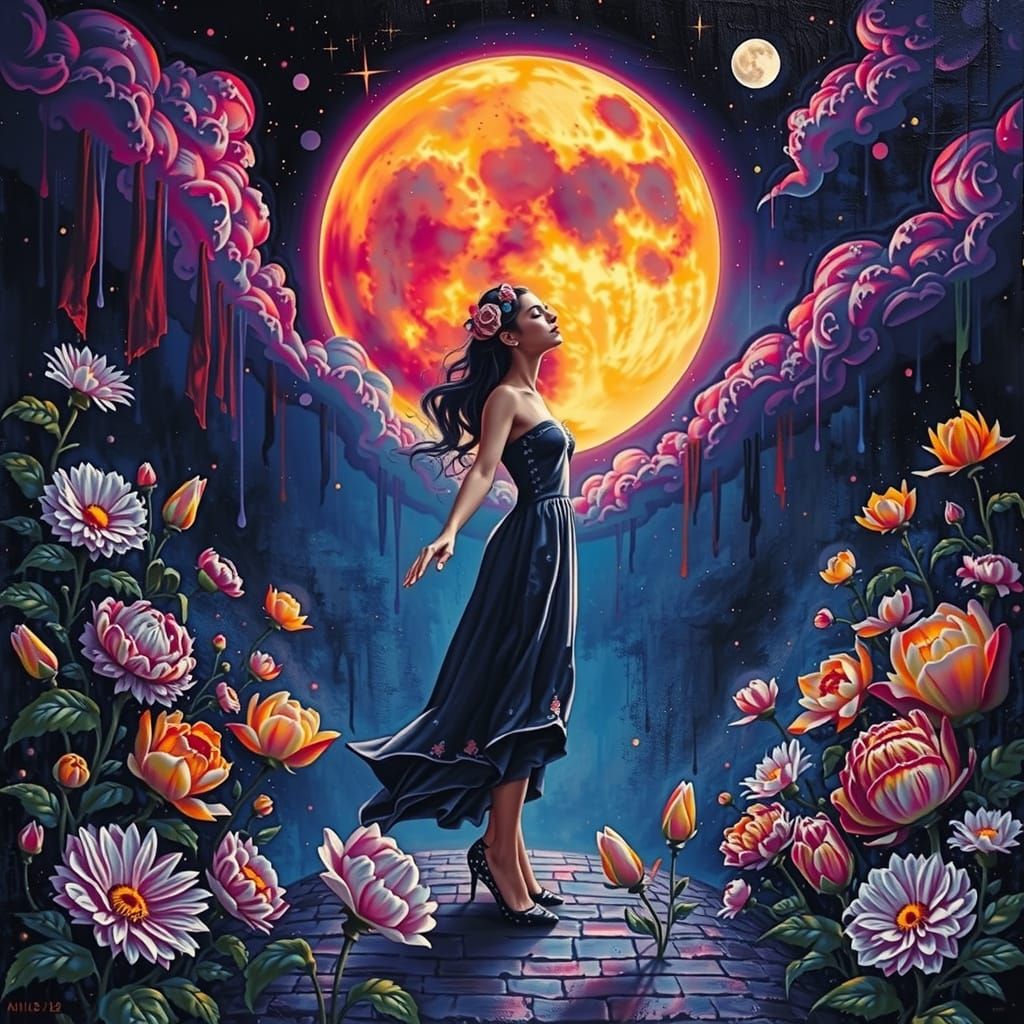 A captivating image of a woman in a white dress worshiping the sun, amidst flowers and a vibrant sky. The artwork blends surrealism with textured, hyperdetailed elements in pink and peach tones.