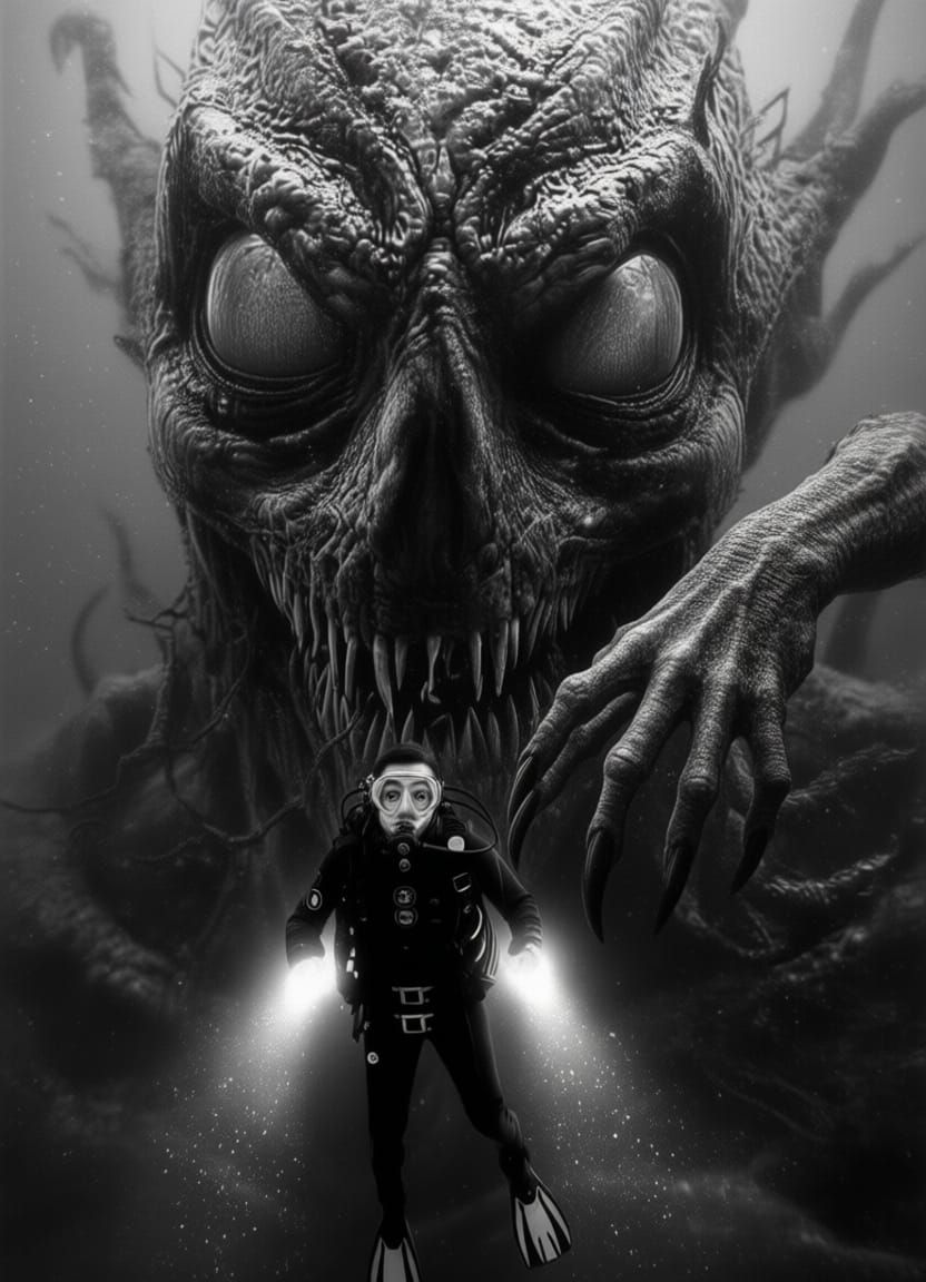 This image shows a vintage black and white horror scene featuring a terrified scuba diver cornered by a grotesque sea monster underwater. The scene evokes found footage and nightmare fuel.
