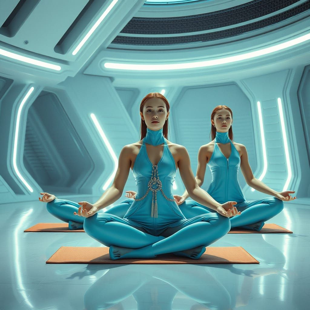 This image depicts three young, futuristic princesses in a serene yogic pose, surrounded by a futuristic white environment with a hyperrealistic aesthetic, inspired by the styles of Syd Mead, Ash Thorp, and Simon Stålenhag.