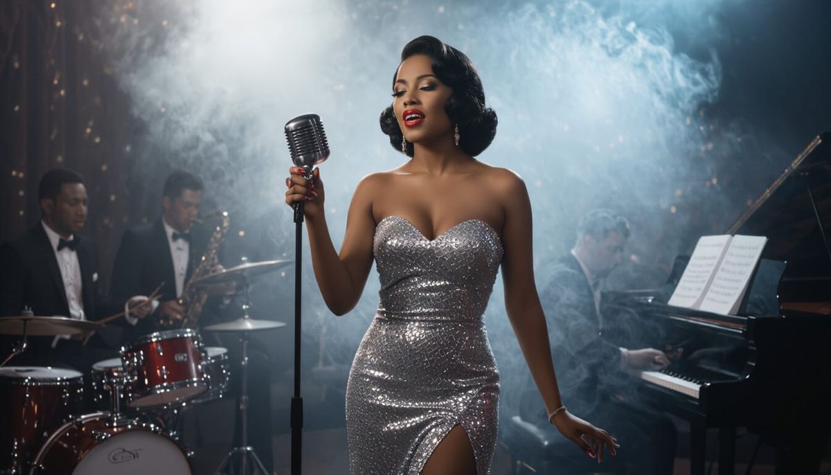 This image shows a Black female singer in a silver sequined dress on a dimly lit stage. A jazz band accompanies her amidst heavy smoke, reminiscent of the 1930s-40s era.
