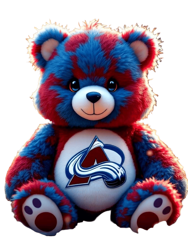 This image features a cuddly, plush Care Bear in a fantastical, idyllic setting, showcasing the Colorado Avalanche logo in intricate detail. The scene is bathed in warm, golden light with delicate mist and realistic shadows, evoking the style of Thomas Kinkade's enchanting paintings.