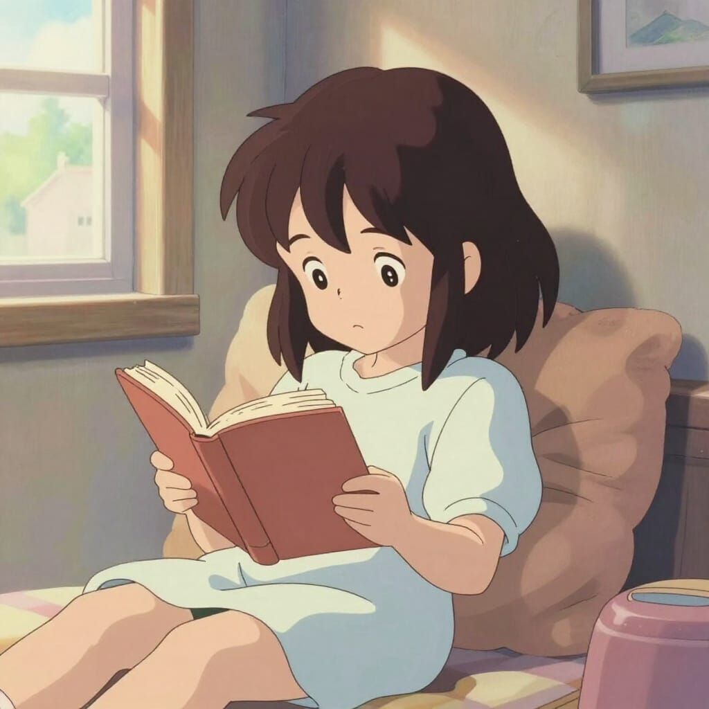 This image depicts a serene lofi scene with a cute anime character reading in a sunlit room. It features soft lighting and a nostalgic atmosphere in a classic anime style.