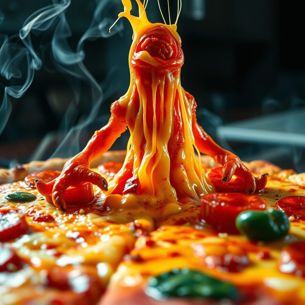 A close-up image shows a steaming pizza with pepperoni. A monster made of melted cheese rises from the surface in a digital art style with golden lighting and gooey textures.