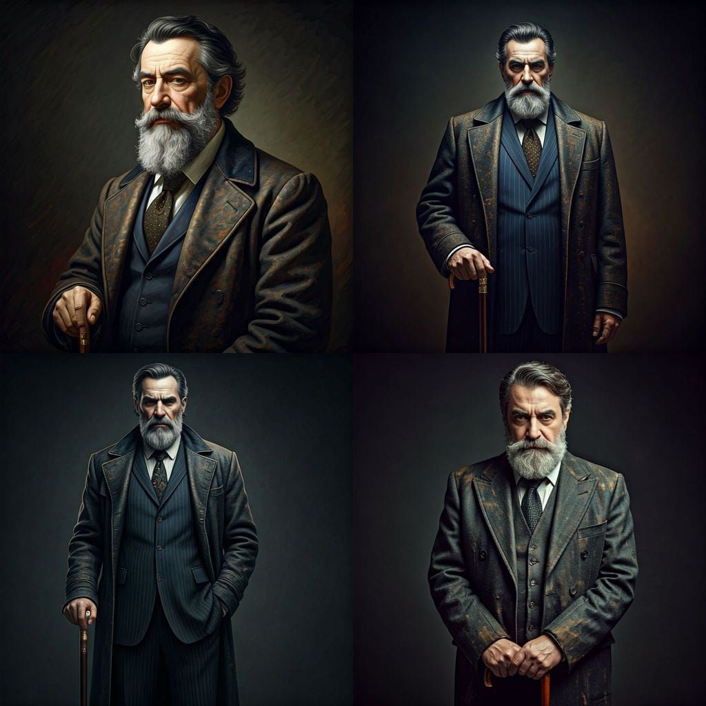 This image depicts a distinguished older man with graying hair and a beard, wearing a well-tailored suit and a worn coat with gold accents. He stands confidently, holding a cane.