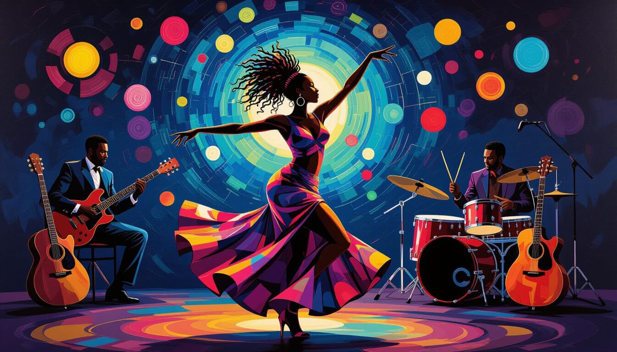 A vivid image showing a dancer amidst swirling lights. This artwork features rhythmic guitars, syncopated drums, and a deep bassline, rendered in a vibrant and expressive style.