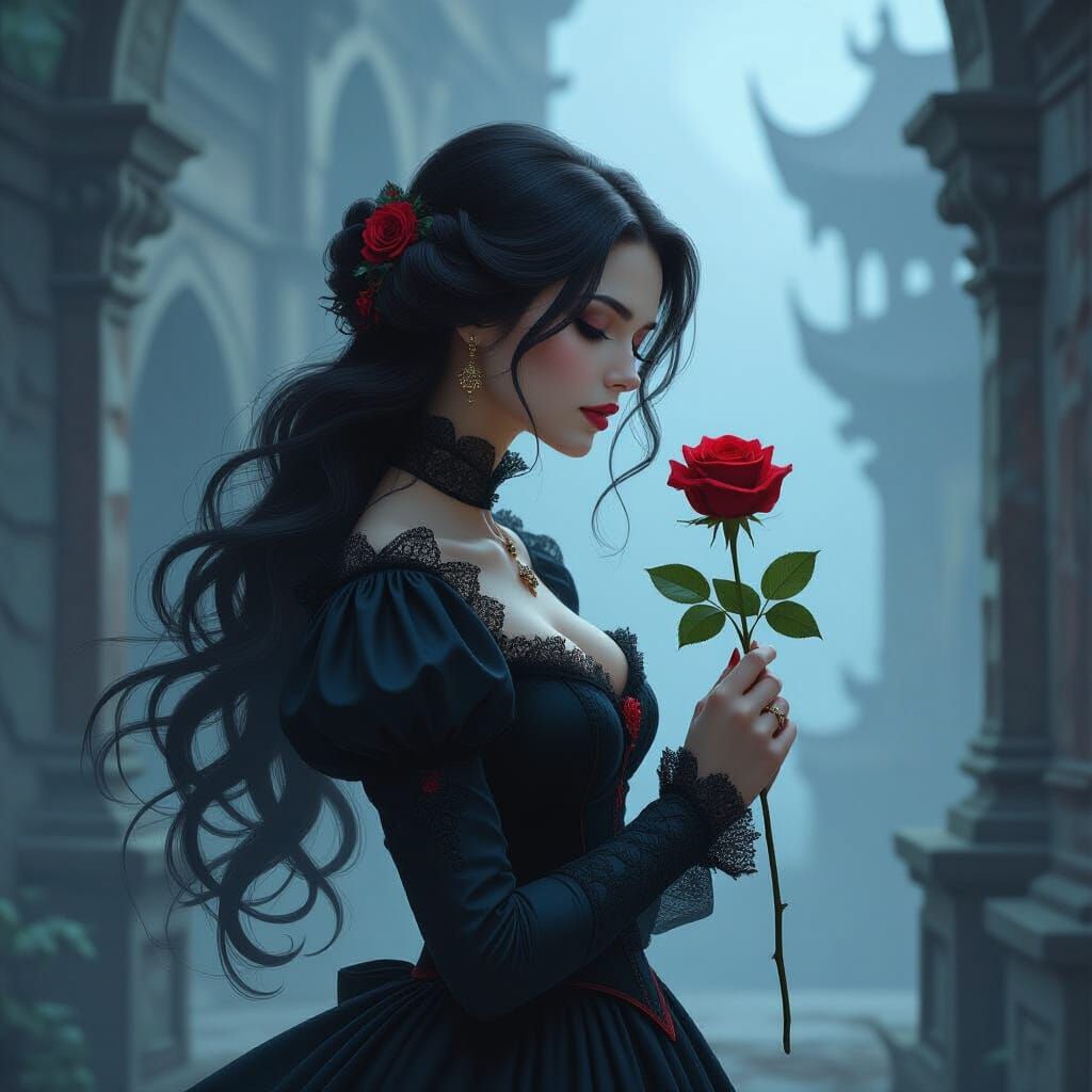 This image shows a woman in Victorian clothing holding a red rose. The background features crumbling architecture and mystical mist, rendered with hyperdetailed artistry and a romantic aesthetic.