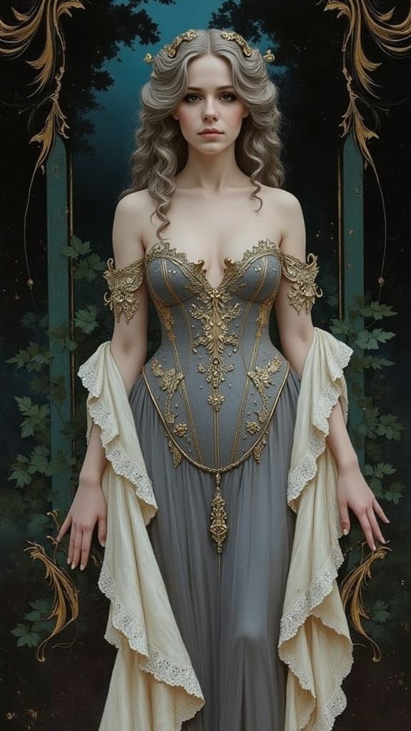 This portrait features a lady covered in velvet and lace, with long black curls and intricate design, set against a hyperrealistic night time background in a Rococo style.