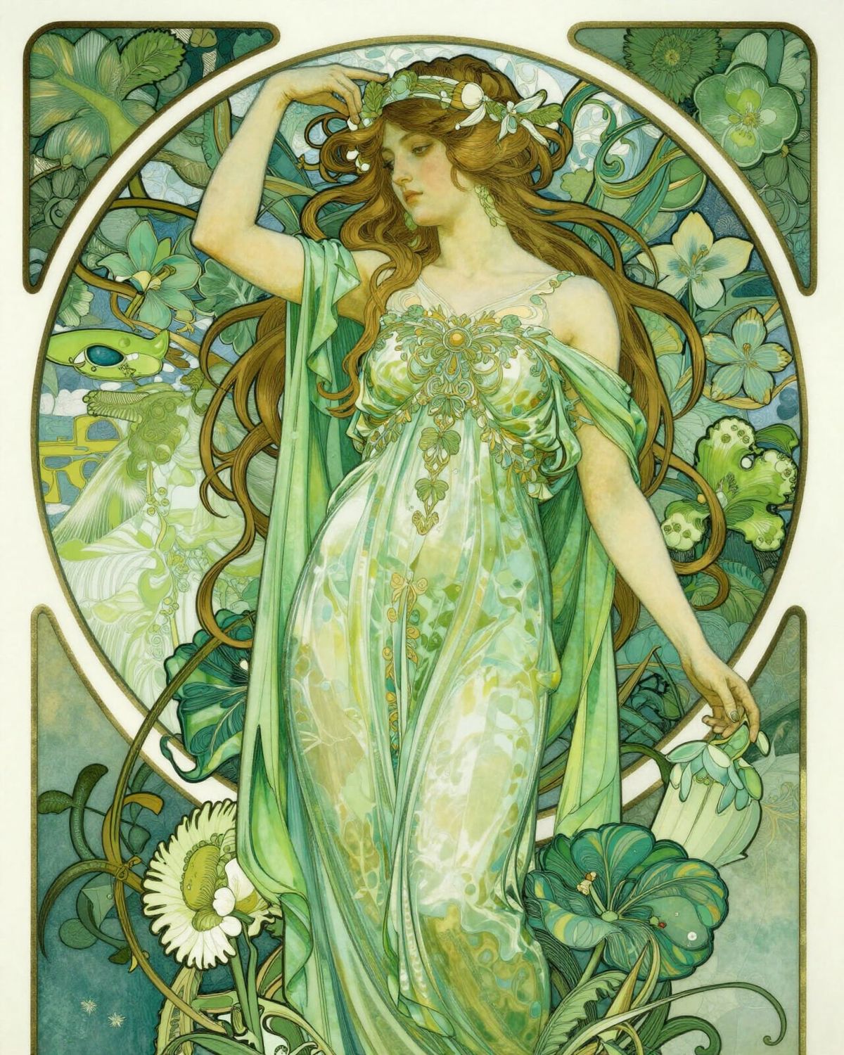 This image depicts a goddess of nature in the Art Nouveau style, with a dominant green color palette. It features meticulous detail and intricate artistry, reminiscent of a master painting.
