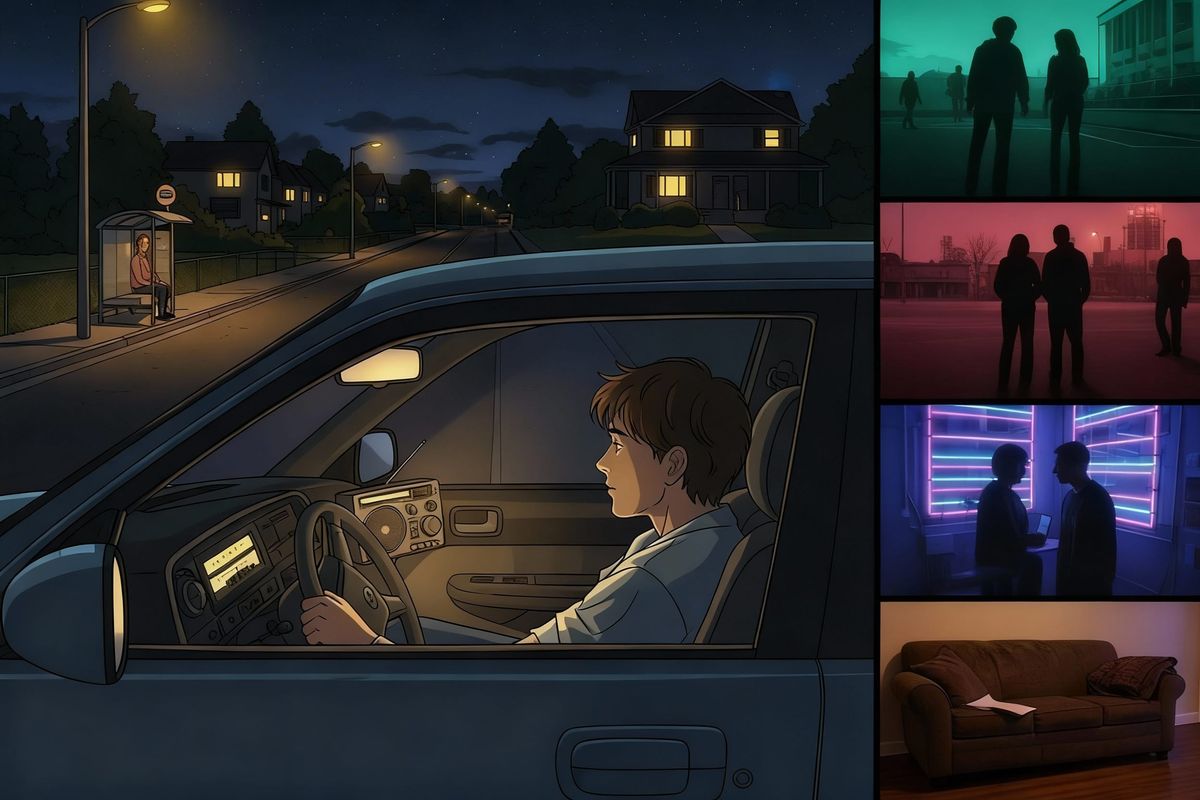 This image captures a nostalgic, bittersweet mood reminiscent of early 90s alt-rock. It depicts a solitary car on a suburban street at night, reflecting themes of teenage heartbreak and lost romance.