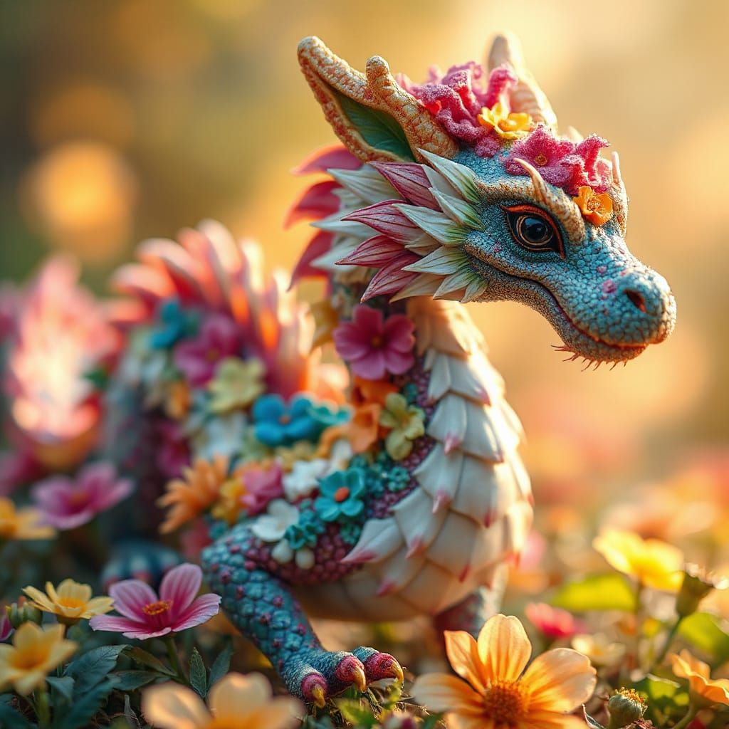 A stunning close-up of a giant dragon formed from colorful, delicate flowers. Rendered in an impressionist style with soft textures and warm, golden light.
