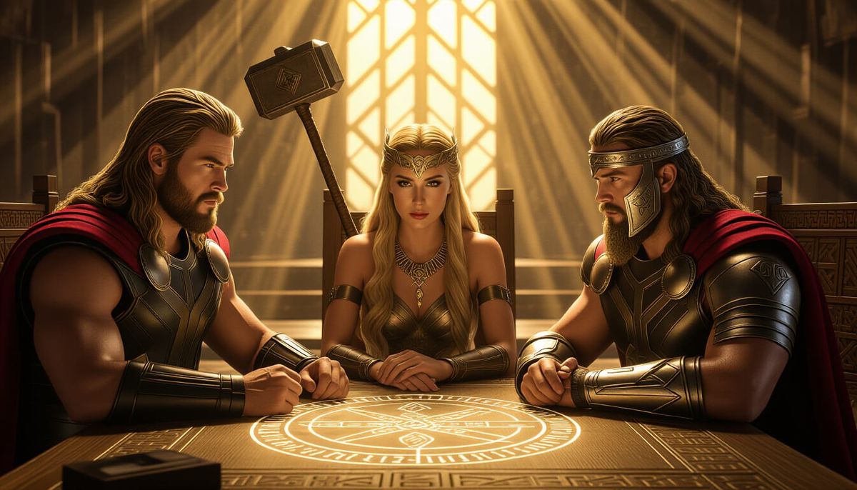 This image depicts a dramatic council of Norse gods in Asgard. Thor, Freya, and Tyr are gathered, illuminated by cinematic god rays with a rich golden hue, presented in a photorealistic style.