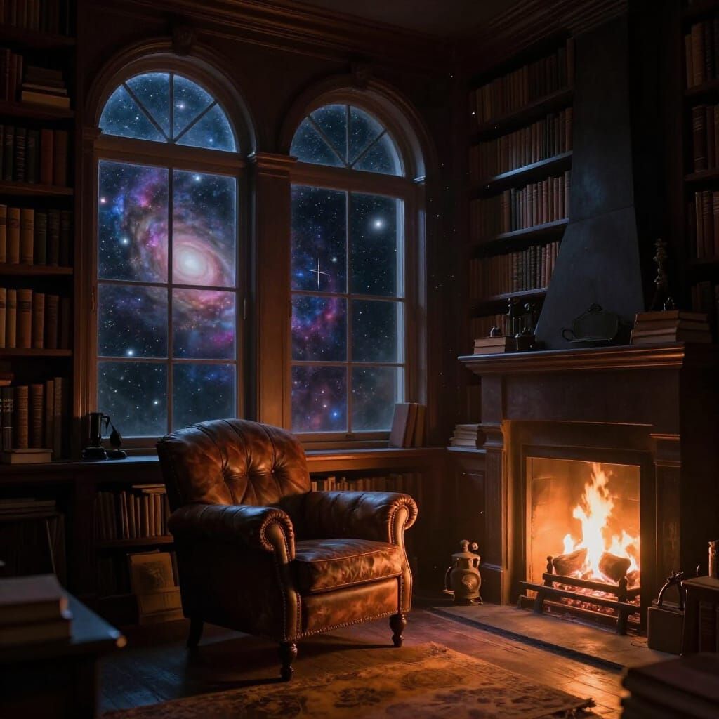 This image depicts a surreal, cozy library interior. Large windows reveal outer space scenes, while a fireplace provides warm light. The style is dreamlike and fantastical, evoking Magritte and Varo.