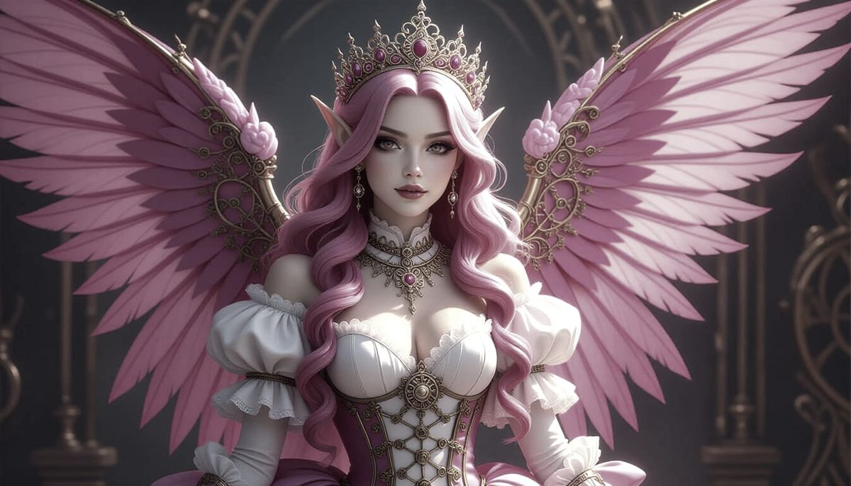A regal faerie queen with large, ornate pink wings and flowing pink hair, dressed in an elaborate steampunk gown adorned with gears. Dramatic lighting highlights metallic textures and her regal expression.