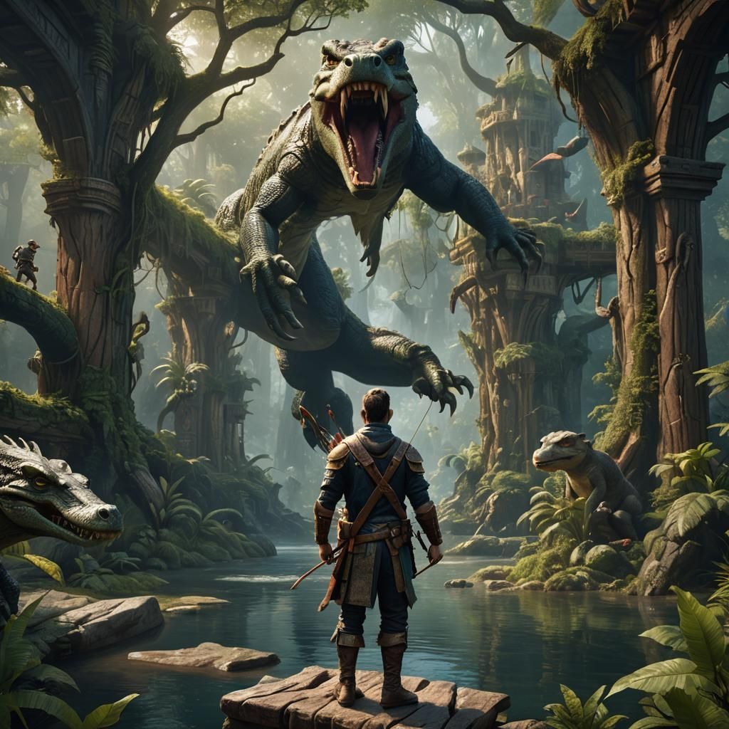 This image shows a man with a mustache practicing archery in a fantastical jungle environment. The digital painting features vibrant colors and intricate details, as seen in fantasy concept art.