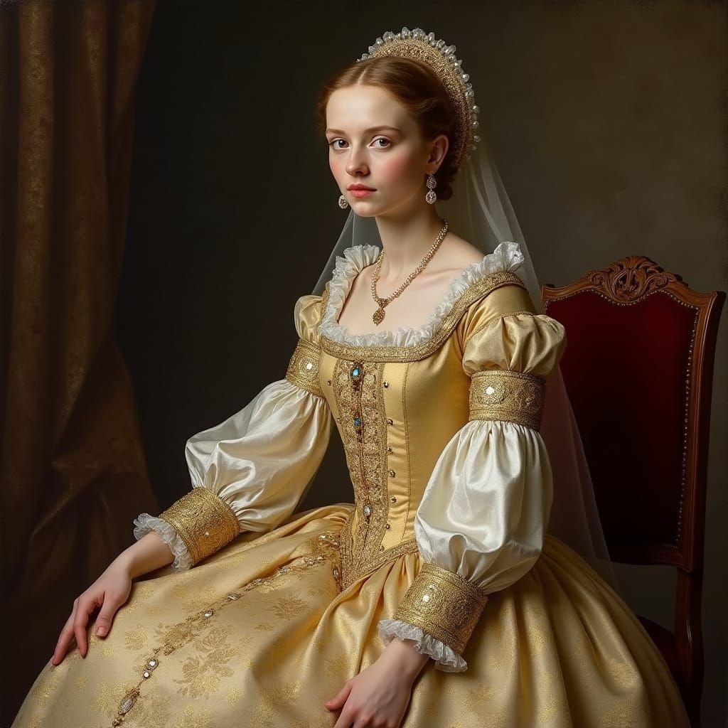 A portrait of a 16th-century lady in luxurious cream and gold attire. The painting captures intricate details and dramatic lighting in a miniature, realistic style, with maximalist opulence.