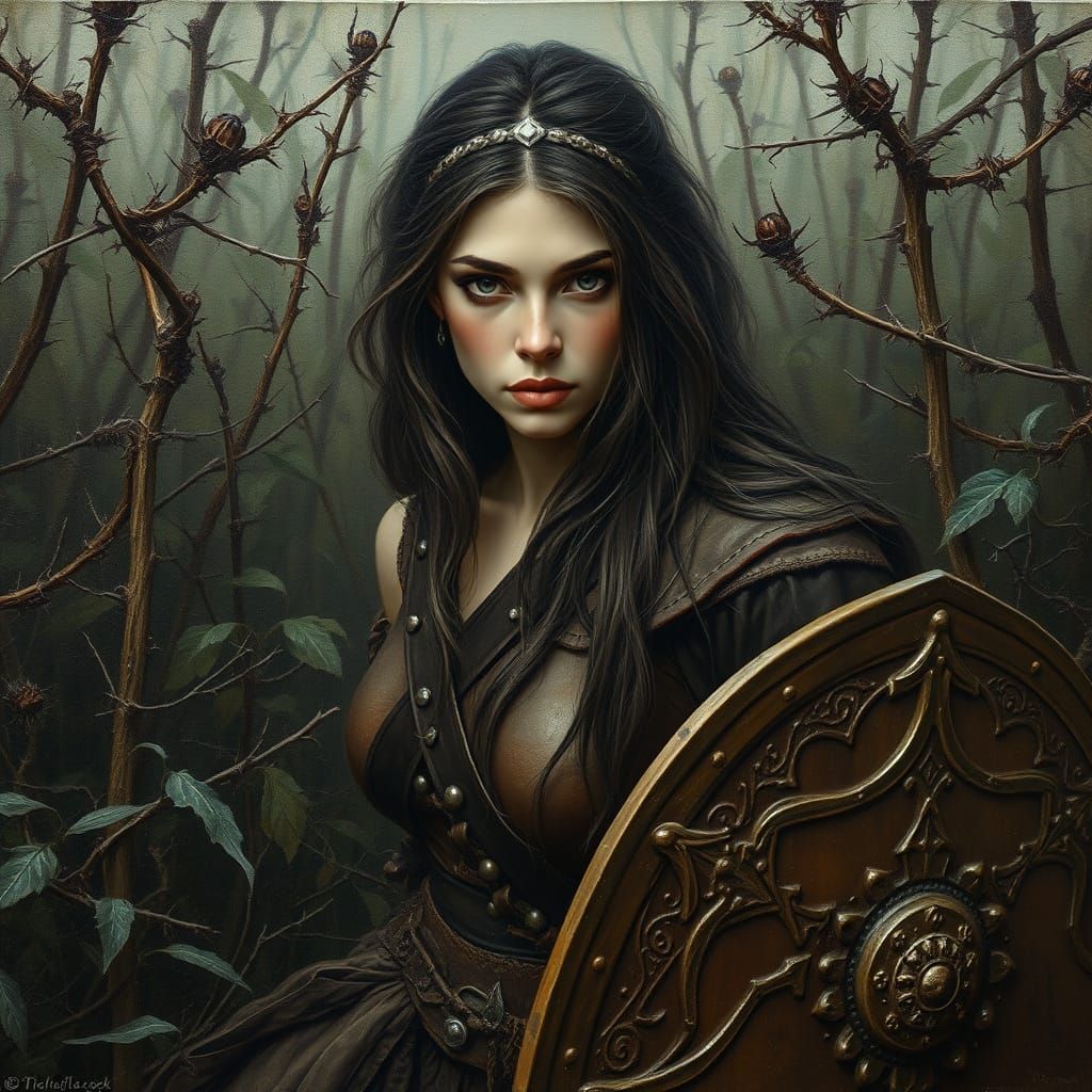A striking picture of a Norse goddess pushing through a thicket. The painting features visible brushstrokes and textures rendered with bold, tactile techniques in a misty palette.