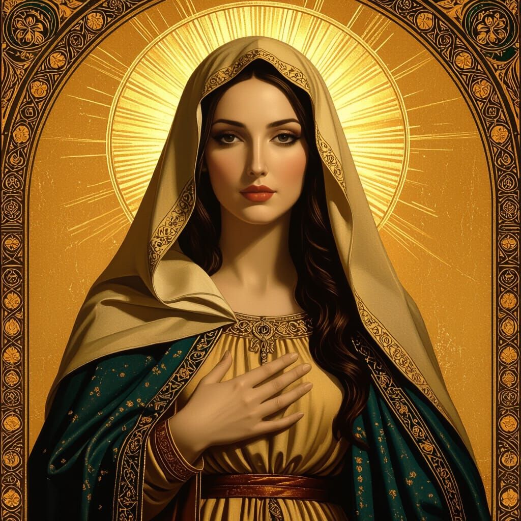 A luminous portrayal of the Virgin Mary, featuring the likeness of Monica Bellucci, bathed in warm golden light, rendered with dramatic chiaroscuro and elegant art nouveau influences.