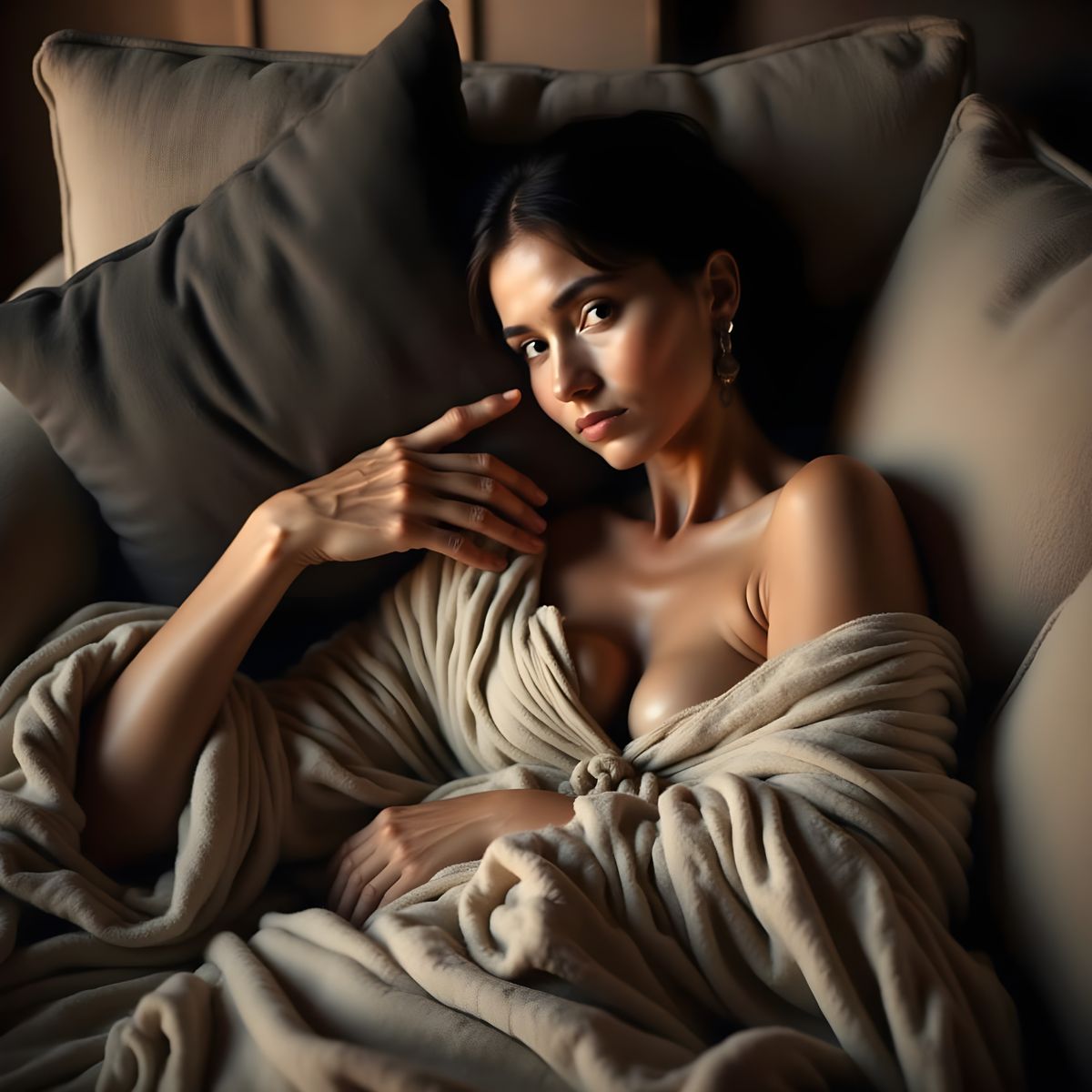 This image captures a serene 30s woman reclining on a couch, her relaxed pose and soft expression inviting intimacy. The intricate patterned design on the beige and gray tones of the couch and pillow add a sense of subtlety to the scene, as warm natural light bathes the subject in a relaxed, comfortable ...