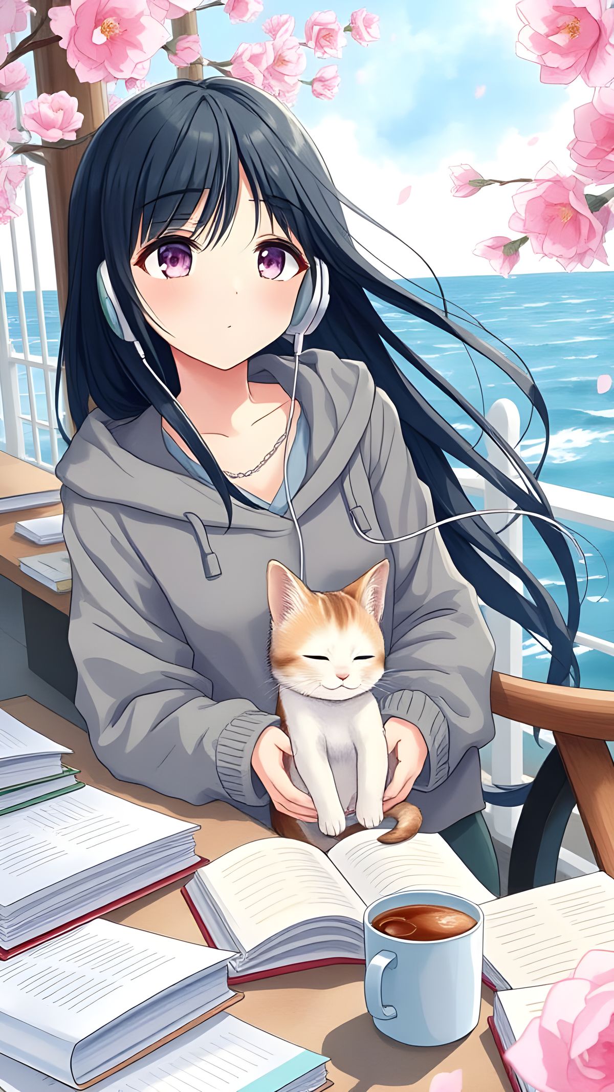 This image shows an anime girl lost in thought in a seaside café, surrounded by books and coffee mugs, with a soft cat in her lap and headphones nearby, set in a tranquil, watercolor-inspired world reminiscent of a serene manga page.