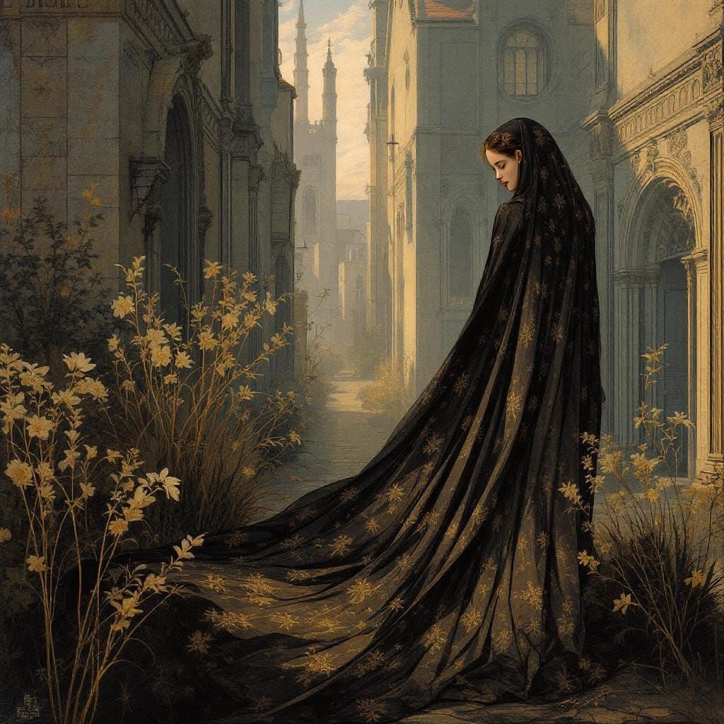 This image shows a woman walking down a quiet street. The artwork features flattened planes and decorative patterns in a gothic aesthetic reminiscent of medieval romance.