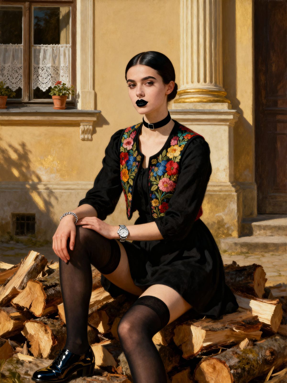 A detailed portrait of a woman in a black dress and floral vest, seated outdoors. Inspired by Dutch Golden Age painting with rich colors and soft light.