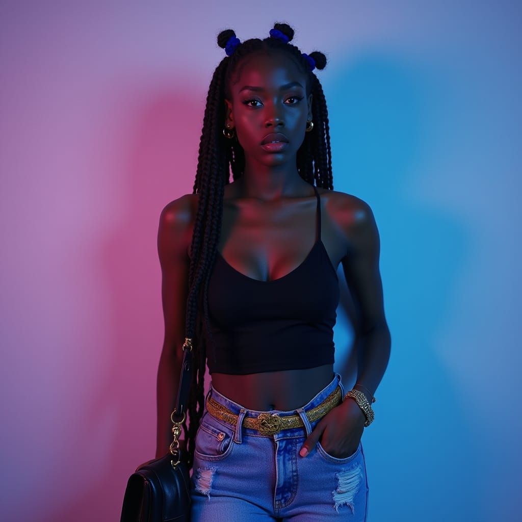 This captivating image captures a young woman with luminous golden brown skin, adorned with intricately braided hair and a delicate F-shaped clasp. Set against a soft, artistic blue-pink background, this cinematic still embodies the essence of a high-fashion editorial spread with hyper-realistic, cinemat...