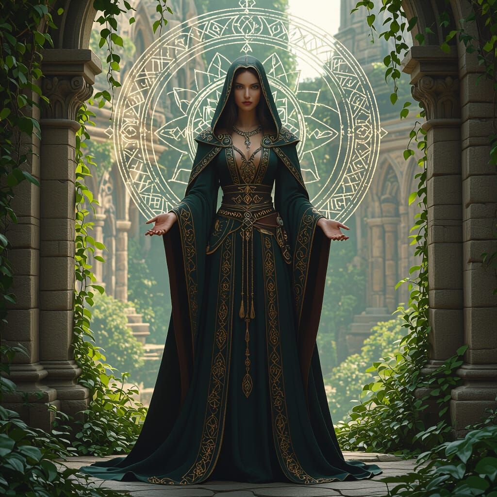 This image shows a medieval woman in elaborate robes, set against a backdrop of mystical symbols, vibrant greenery, and old stone buildings. The image has the look of fantasy concept art.