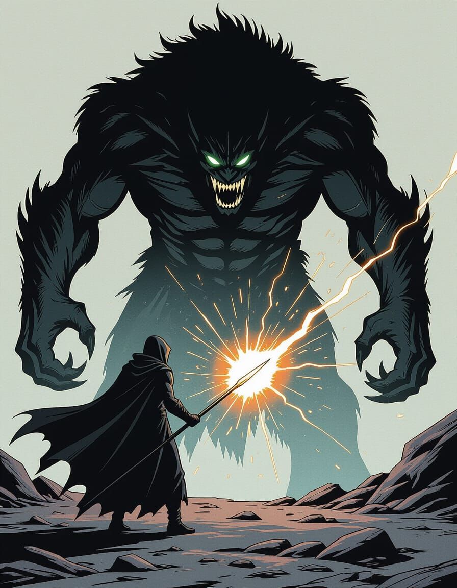 This comic book cover art depicts a lone figure with glowing veins facing a colossal shadowy monster. The minimalist, intense scene features explosive energy and primal power, rendered with a haunting, visceral style.