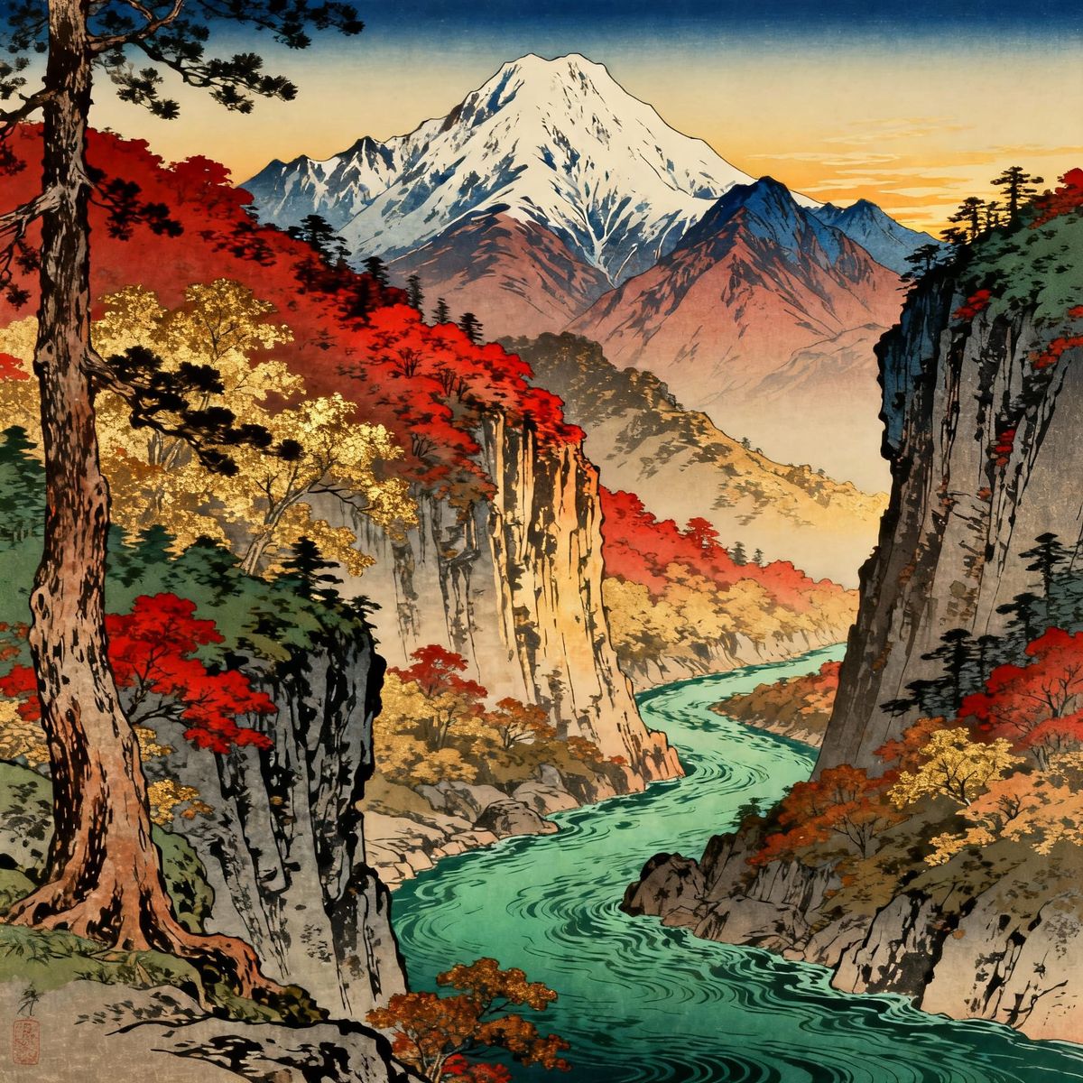 This AI-generated image captures a breathtaking Japanese landscape with vibrant autumn foliage, snow-capped mountains, and a winding river, rendered in the traditional ukiyo-e style with dramatic lighting.