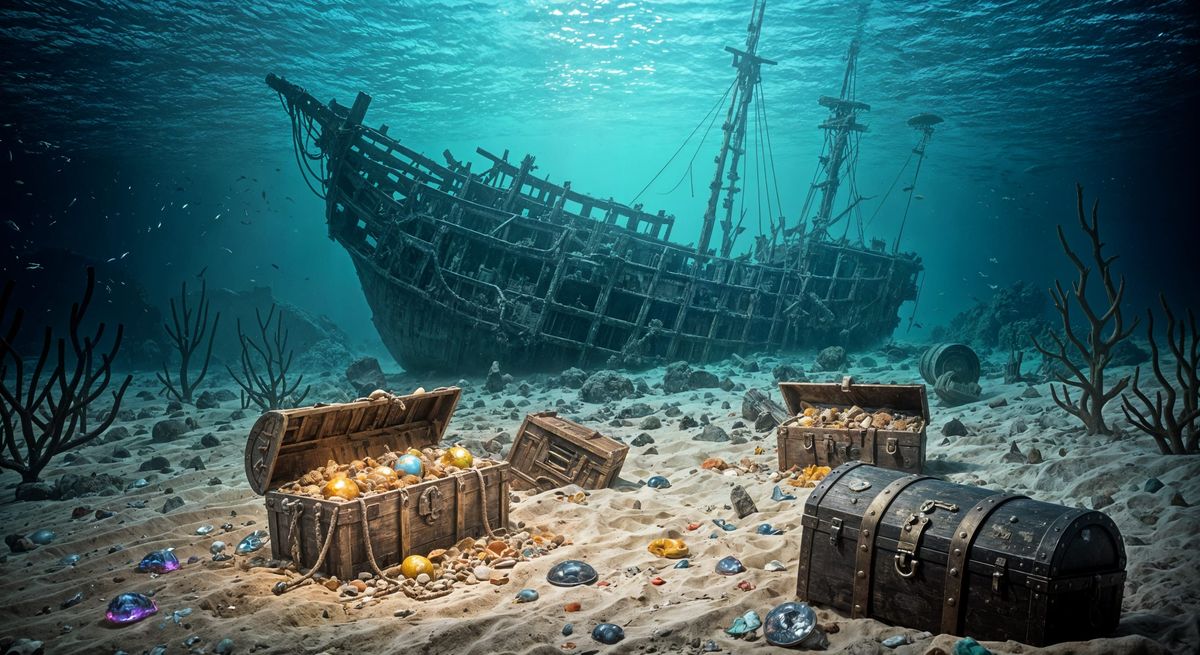 This image shows a sunken galleon wreck teeming with treasure on the ocean floor. The cinematic image features treasure chests overflowing with gold and gems amid coral and sand.
