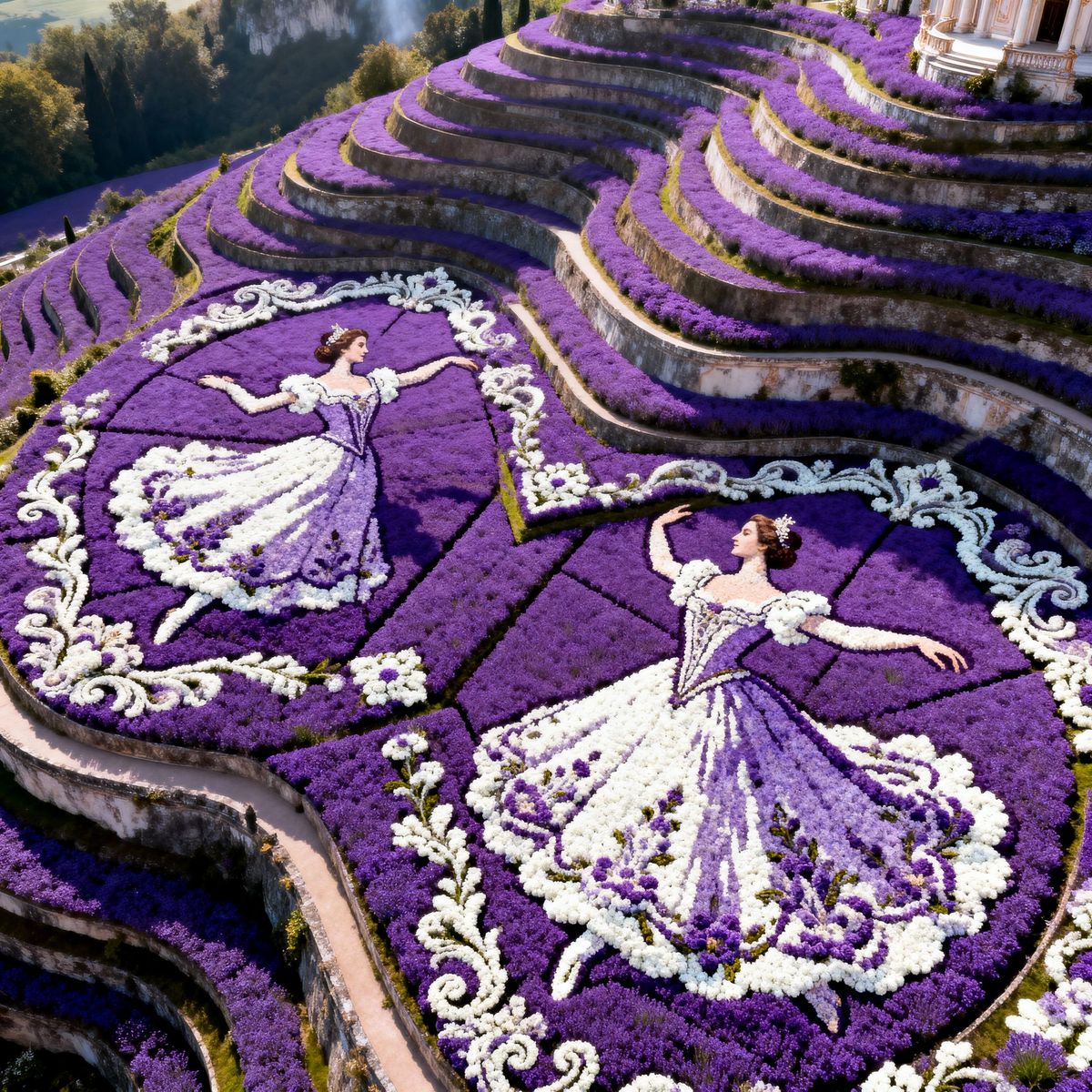 This image depicts an aerial view of hills and valleys shaped into intricate Baroque patterns with purple flowers. It forms a stunning portrait of ballroom dancers, highlighted in white, showcasing a unique floral landscape.