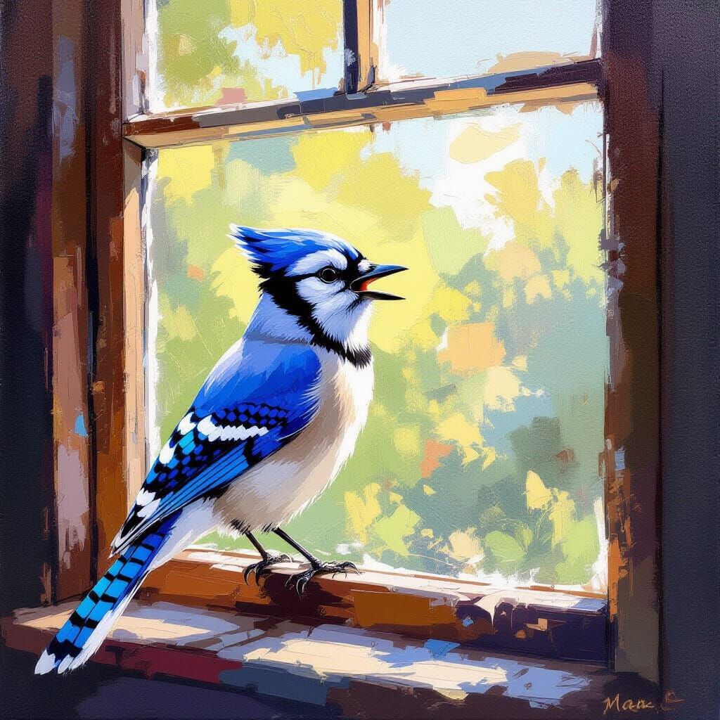 A vibrant image of a blue jay singing outside a window. The artwork employs thick brush strokes and layering to create a textured, impressionist style.