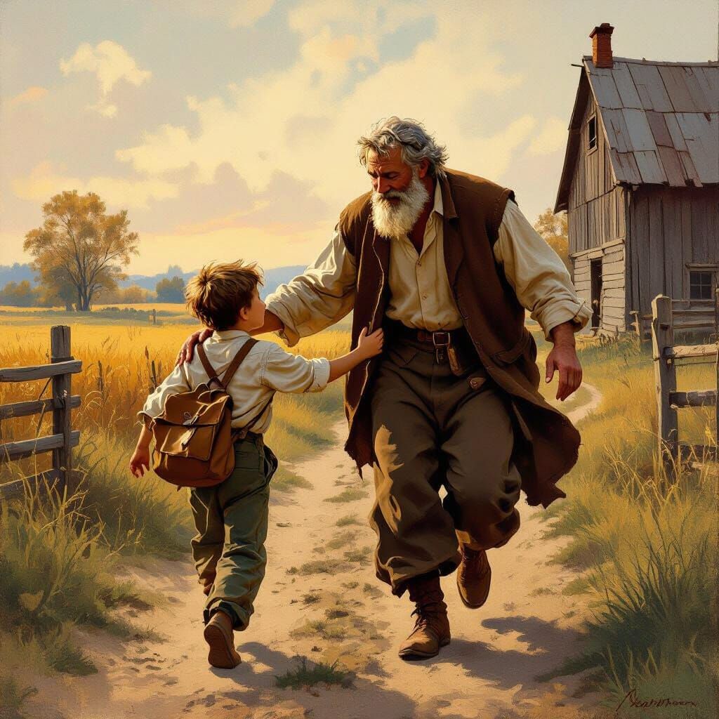 This image shows a son returning home, tired, to a welcoming embrace from his father. Warm, earthy tones and dramatic lighting highlight the powerful emotion of forgiveness and reunion.
